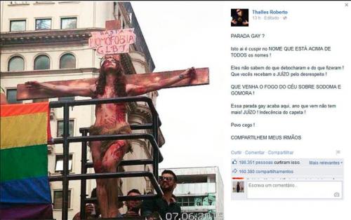 E continuou o desafabo: "Gente ignorante que não entende arte e acha que Parada Gay e só ir cheio de brilho e com ra** pra fora, carnaval fora de época é mais bonito do que fazer um protesto da realidade que vivemos. O dia que vocês sofrerem agressões, xingamentos, apanharem, fizerem piadinha de vocês, recorram aos Gogo Boys e as travestis que vão nuas sem protestar por nada, ao invés de quem se dispôs a fazer isso para acordar a sociedade hipócrita. Bando de mal agradecido... beijo no ombro pra quem não gostou. Nem Deus agradou a todos, não é mesmo? Eu nem faço questão, mas o dia que sofrerem agressões não reclamem e muito menos achem forte. Madonna, Lady Gaga, entre outras, fizeram coisas muito piores com uma cruz e elas vocês não falam nada. Eu representei as dores, olhava para cima, interpretava as dores e até chorei lembrando de pessoas amigas minhas que faleceram há alguns dias, bando de iludidos".